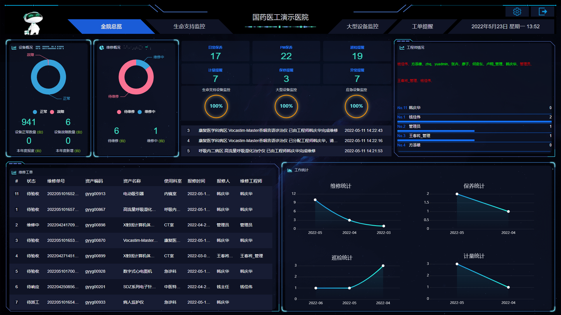 可满足医院医工科、总务科和信息科等不同科室对资产管理的使用需求,是集医疗资产评估分析、医院资产实时管理、临床设备使用过程、医疗设备质控管理、医工服务过程管理、应急调配中心、医疗设备效益分析为一体的,智慧医疗设备全生命周期管理软件。